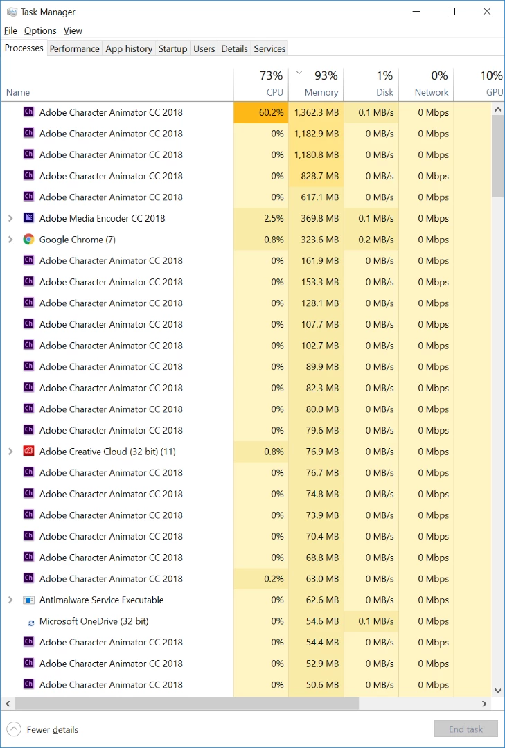 I queue up say 20 scenes to be rendered via media encoder (using CTRL-M in Ch), then go off and do something else. When I come back, I have a page full of character animator processes, hogging memory. It is like they are not exiting at the end of a render, so eventually the computer runs out of memory. Exiting Media Encoder causes the processes to exit (and memory is freed up). Does this look like a bug? It means I cannot queue all the scenes in one hit and leave the computer on overnight to complete the render. (I think my episodes take about 4 hours to render on my lightweight laptop.)