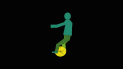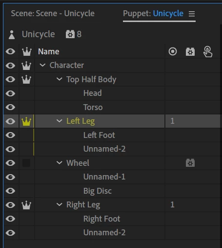 The puppet structure. The wheel is a top level layer. The legs are attached using Hinge so the feet stay flat (pretty flat anyway). The body is also independent attached with hinge so the body does not fly around in cycles with the wheel. The wheel has a Transform behavior attached which is used to rotate the wheel.