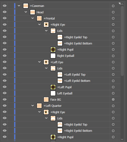 I have a puppet with different head views. The eyelids on one of the eyes behave oddly in any of the side views (puppet attached). The layer structure is as follows: