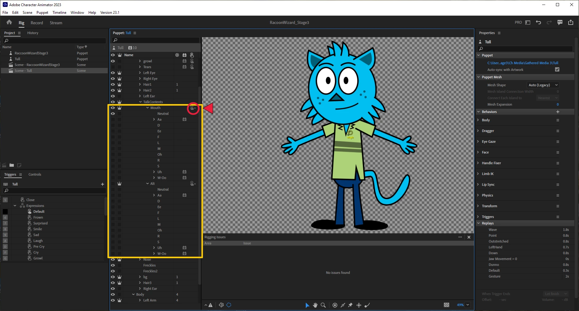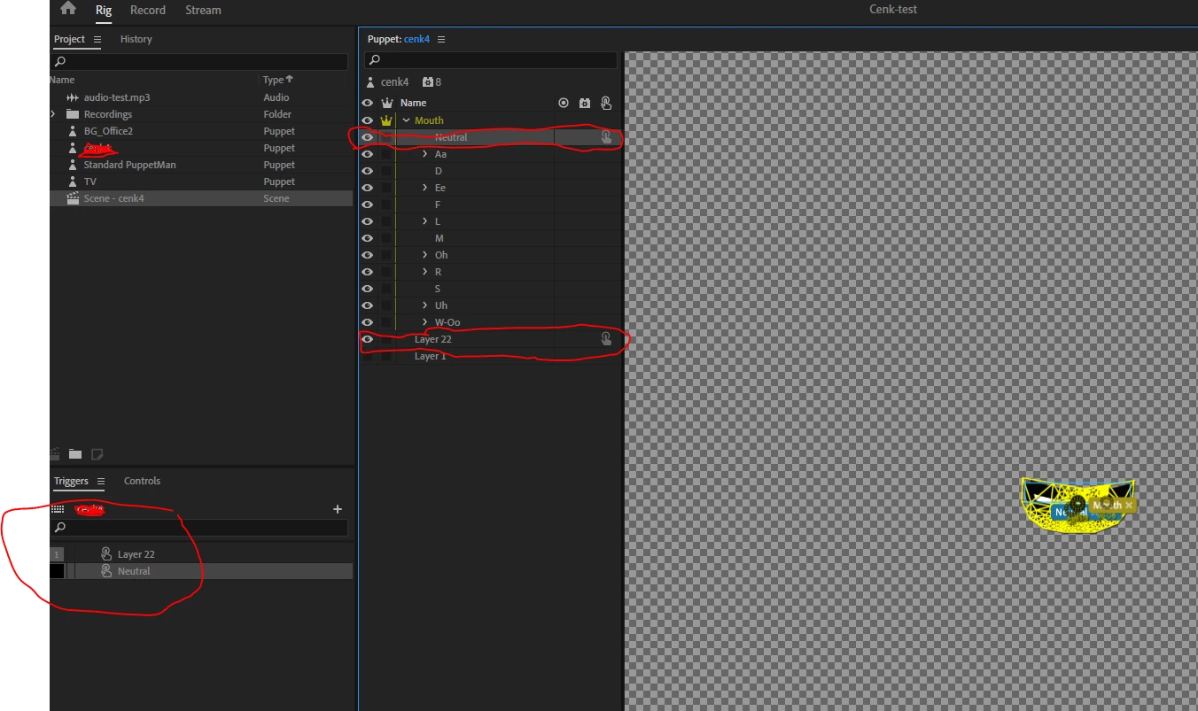 How to create a trigger to swap a Neutral mouth drawing on the puppet?