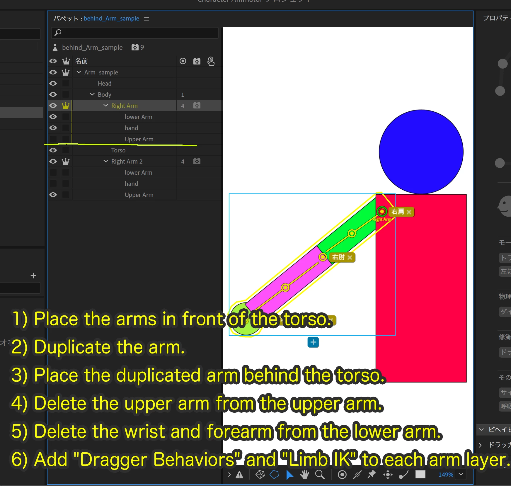 But thus far I wasn't able to achieve it. It seems that no matter what I do, since the arm is spread out in two independent layers with no common parent, Character Animator does not treat it as one arm.
