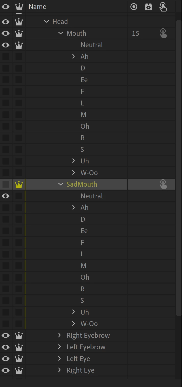 I am able to make the smiling mouth disappear and be replaced by a frowning mouth. I know how to do that. But I can't make the frowning mouth talk. I have drawn out different shapes for the frowning mouth when it talks (separate from when it is happy) but instead it just desplays the default frowning mouth. It does not react to sound or the shape of my mouth. I tried individually dragging them in but that just makes them go on top of eachother. Please help.