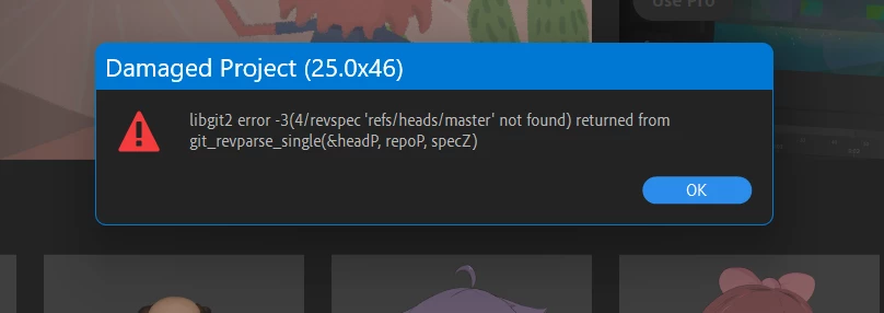 I was editing a scene in my Character Animator project and the application crashed. I restarted but cannot reopen the project. Based on the 2022 thread I located the repo.noindex folder and tried changing the .rope filename to projectdata_old.rope but it did not fix the issue. Here is what I am seeing when I try to open the project file: