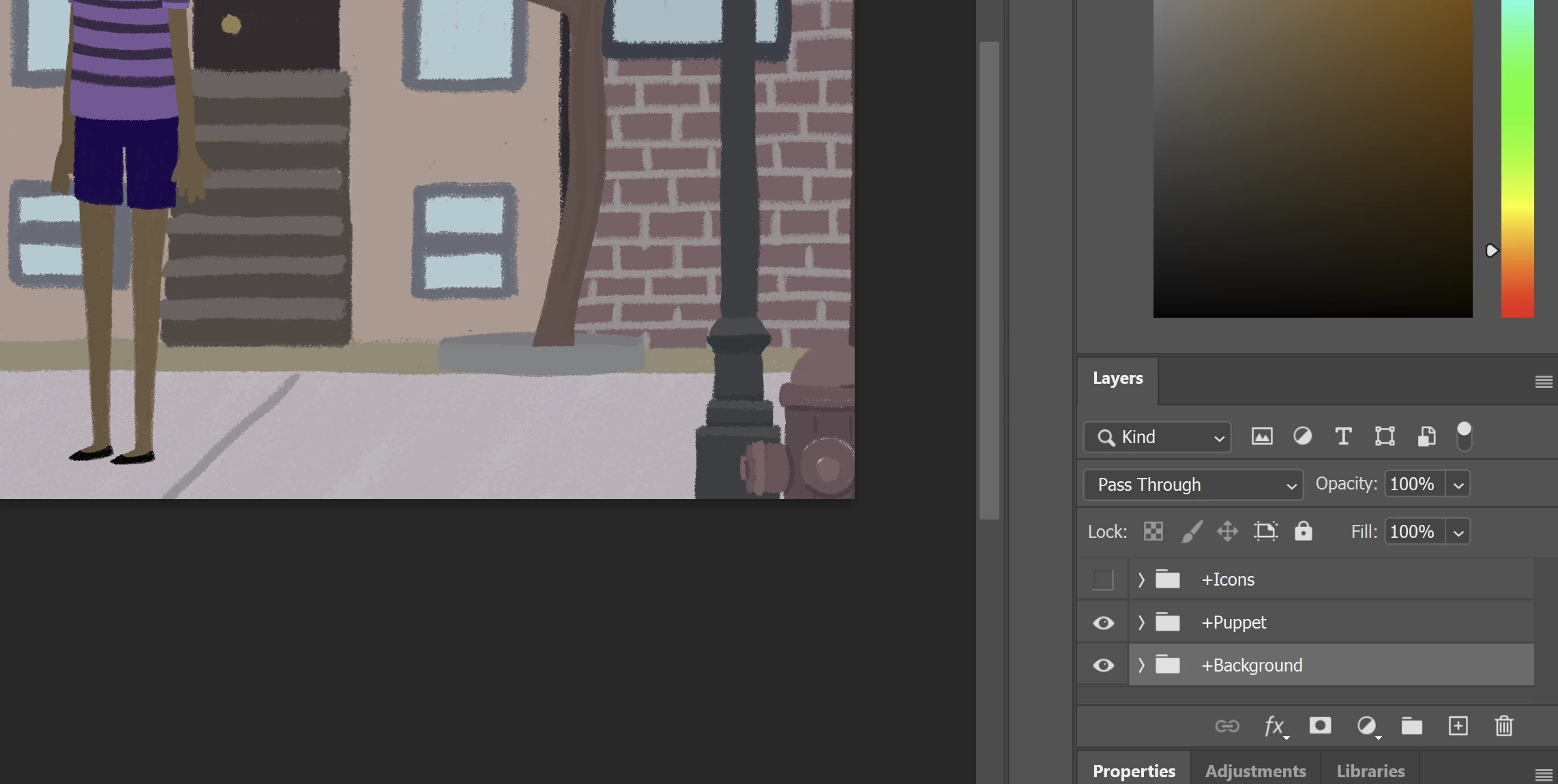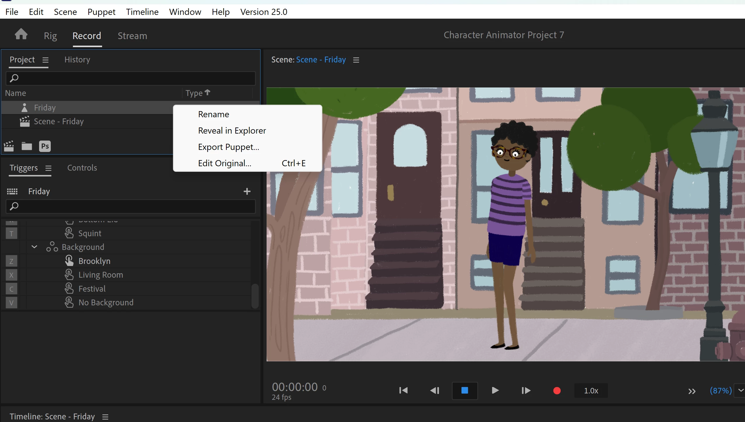 Once the backgrounds have been deleted, save your file and exit Photoshop. When you return to Character Animator, the puppet will automatically update. Then you will be able to add your new background. by importing it and dragging it into your scene beneath your puppet.
