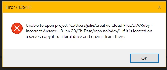 File was opening fine about a week ago. Not sure why this has started occuring. Any suggestions please. I have moved the project file onto my desktop and an external hardrive and am still receiving the same error when opening from all locations.