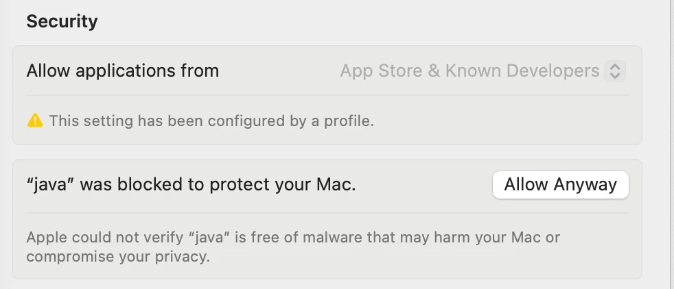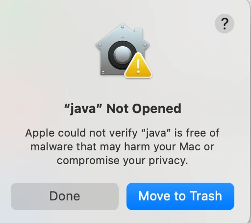 I click on "Done" and in "System Settings:Privacy & Security" the following message appears: "java" was blocked to protect your Mac. I clicked "Allow Anyway" . The above window appears again along with the blocked message. This repeats over and over.