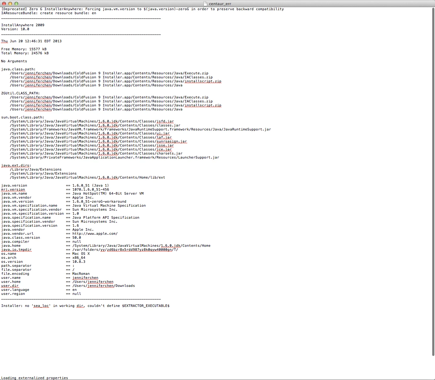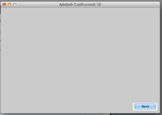I am trying to install either ColdFusion 9 (which is where company is using) or 10 (if I can't have 9) on my Mac 10.8.6. When I click on the dmg file, it shows a running bar and once it's completed, i see a standard installation box (the one you click "agree" "nect" etc...) except there is nothing showing on the box. There is a blue "next" button but I can't click on it. This happens to both ColdFusion 9 and 10 installation. With 9 though, I get a centaur_err file.