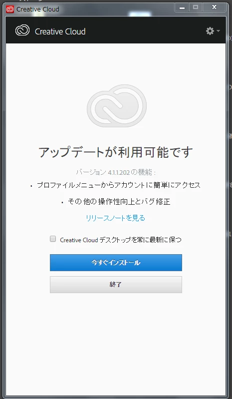 Createive Cloudを立ち上げると、添付画像のとおりの表示(アップデートが利用可能です)が出てくることがあります。