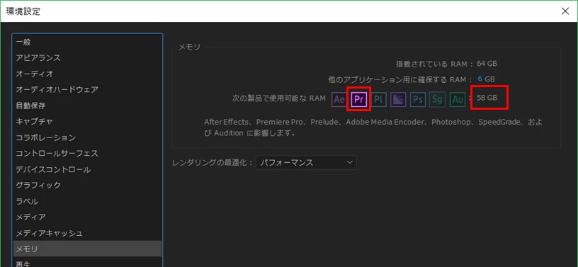 ・Premiere Pro CC2019(またはCC2018)の「環境設定」の「メモリー」で、「Pr」の使用可能なRAMの量を少なくします。これでPhotoshop CC2019の使用可能なRAMの量が増えますので、エラーメッセージは出なくなるのではないかと思います。下図参照願います。