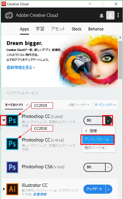・CC2019の「Photoshop CC(v20.0)」の右端の下向き三角印をクリックし、開いたドロップダウンリストから「アンインストール」を選択します。