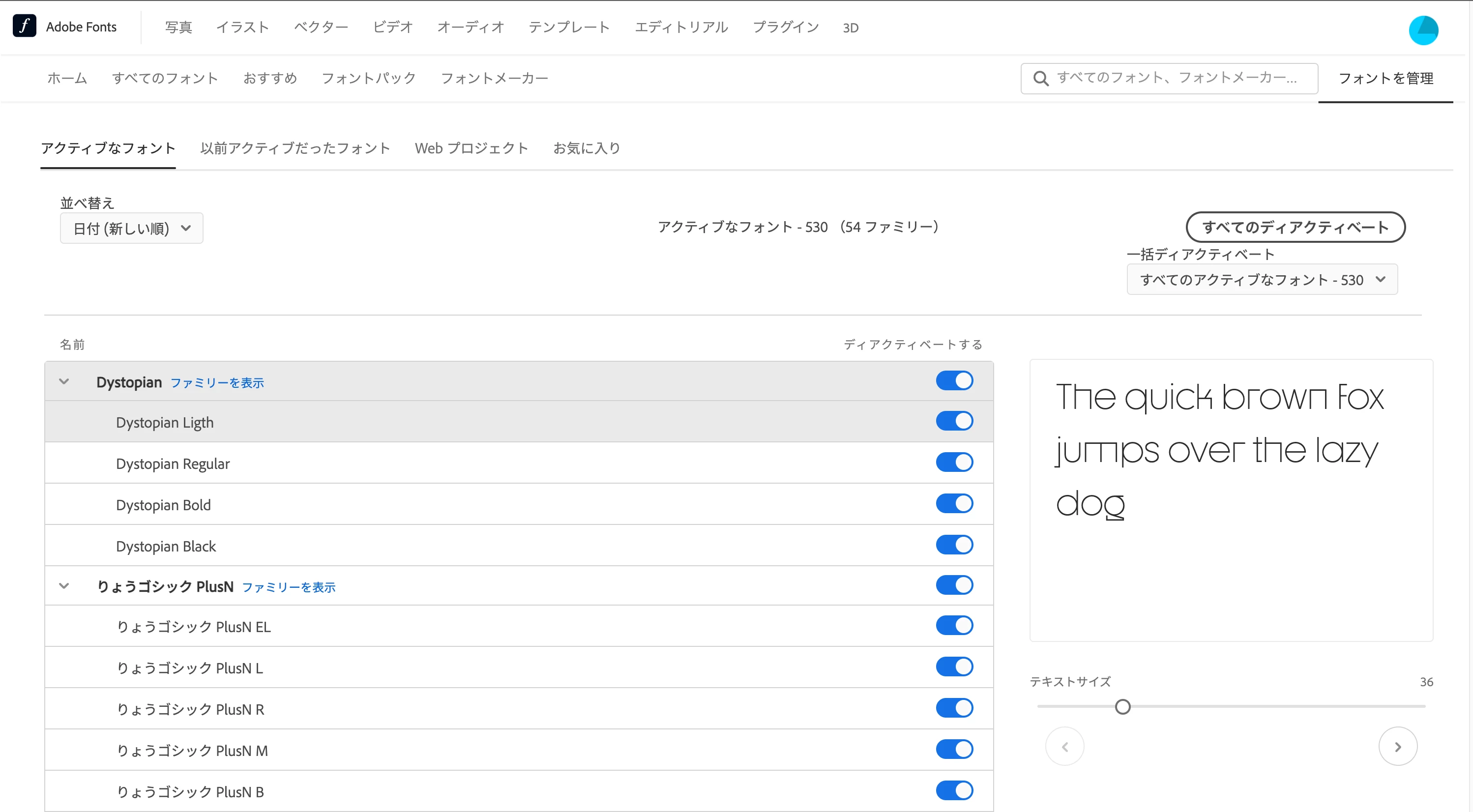 ・ブラウザ上のAdobefontでは過去に使用したフォントをリストにて確認済み アクティベートも完了しています。