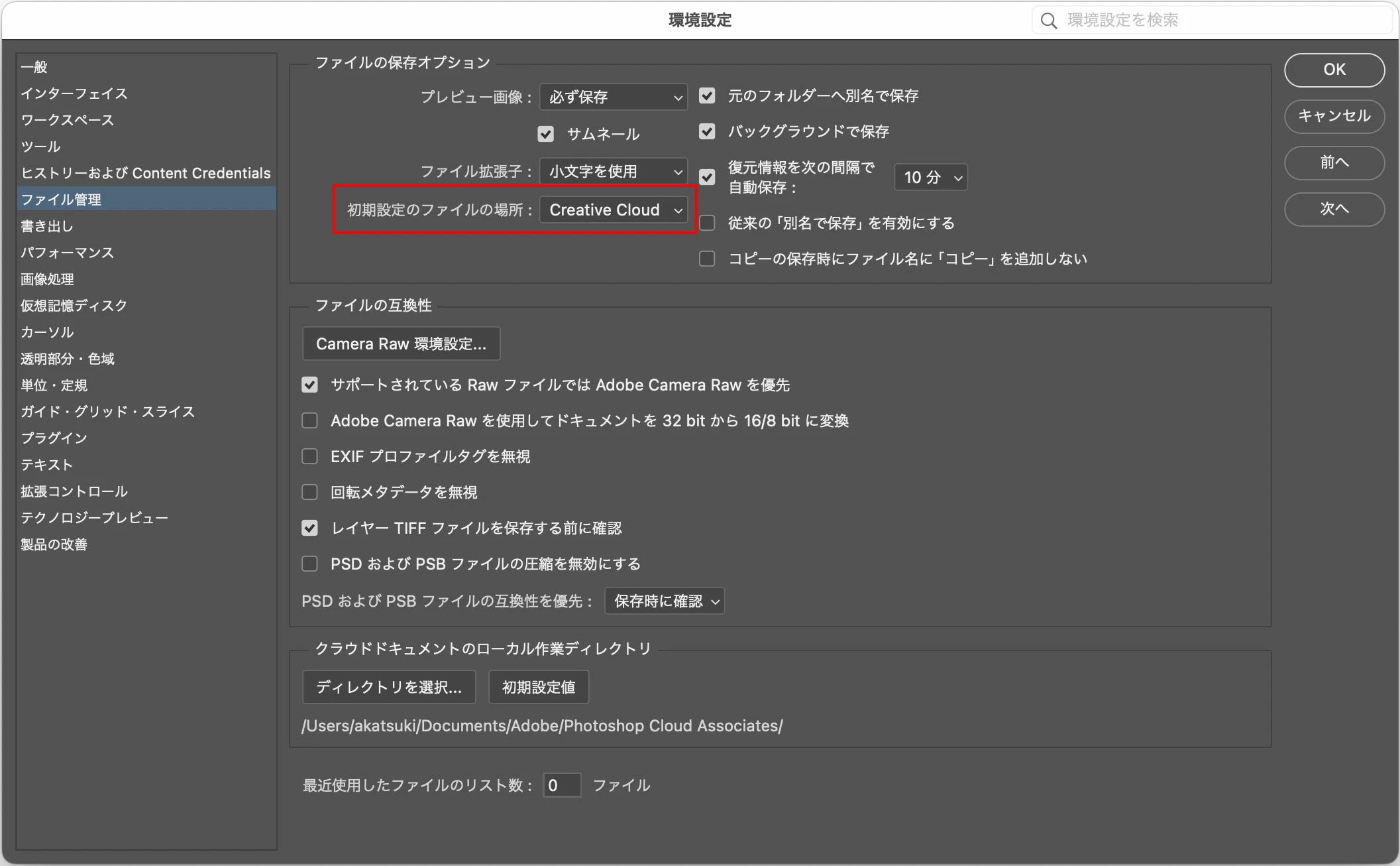 Photoshopの環境設定で「初期設定の保存場所」を「Creative Cloud」にした場合、CCのクラウドスペースにアクセスできますか?