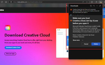 Hello, The installer executable for Adobe Creative Cloud hosted at Adobe Creative Cloud download does not appear to be digitally signed. Because of this, SmartScreen in Edge treats it as a potentially dangerous download.