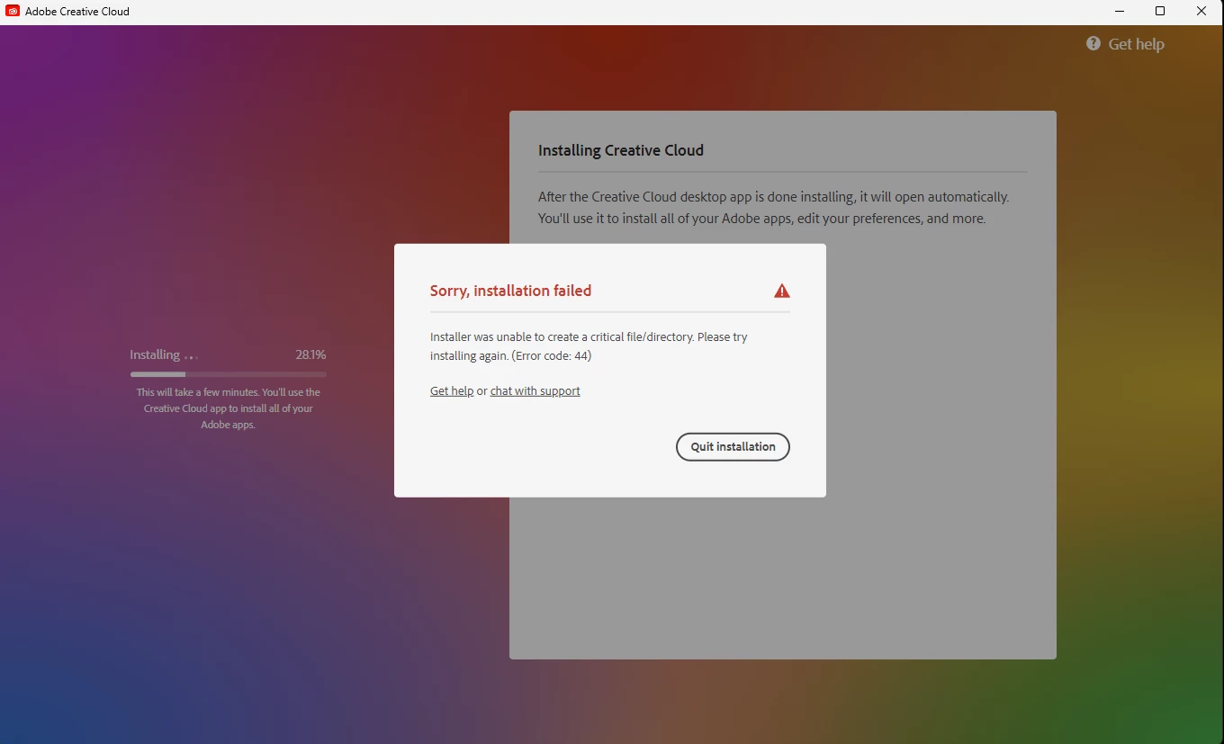 Unable to Install - Error 44 - No Retry Button as suggested in faq