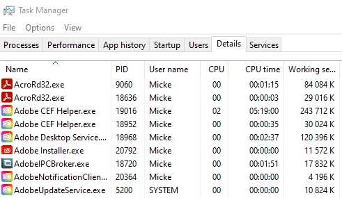 Adobe's background processes consume more than 400MB of my ram, and makes sure my cpu is busy. See above screen shot from Task Manager. Adobe CEF Helper has consumed more than 5 HOURS of cpu time. I don't know what Adobe CEF helper is doing, but I am pretty sure it isn't worth all this cpu consumption.