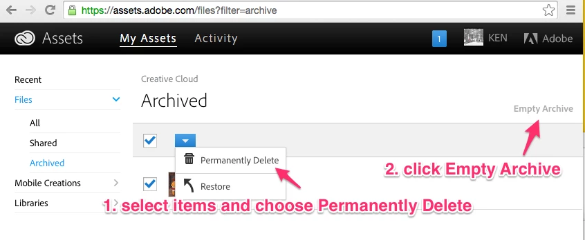 Open a browser and visit Adobe Creative Cloud. You can then Permanently Delete items from the Archive by [1] selecting those you want to delete and choosing Permanently Delete, or [2] if you want to remove everything just choose Empty Archive.
