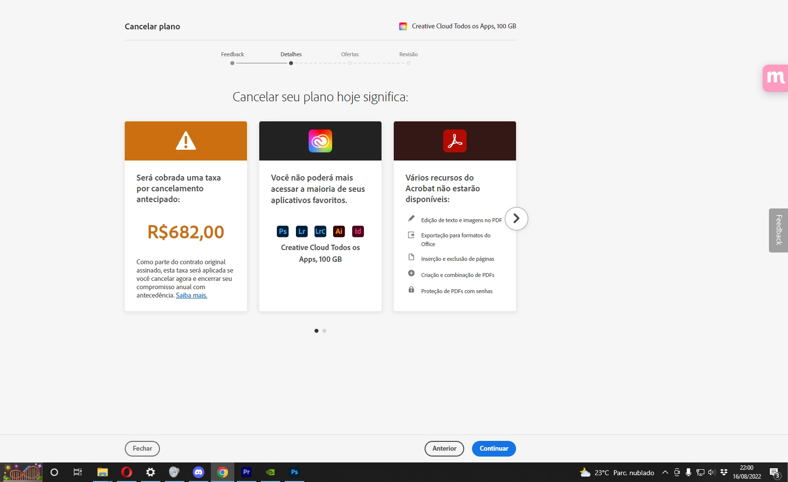 Estou tentando cancelar minha assinatura da adobe dentro do prazo de 14 dias porém ao tentar cancelar a a taxa dos 50% aparece impossibilitando o cancelamento dentro do prazo, tentei falar com o chat mas está indisponível, vou tentar resolver por aqui, se não conseguir vou tentar pelo PROCON