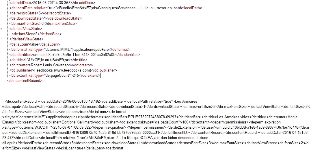 Si je ne me trompe pas, au moment du transfère ADE génère un fichier manifest.xml, listant les métadonnées des ressources empruntées.