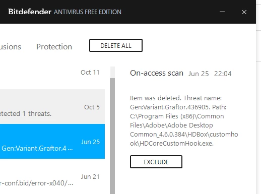 Bitdefender started reporting a virus in the Creative Cloud desktop application in Windows 10 Home Edition