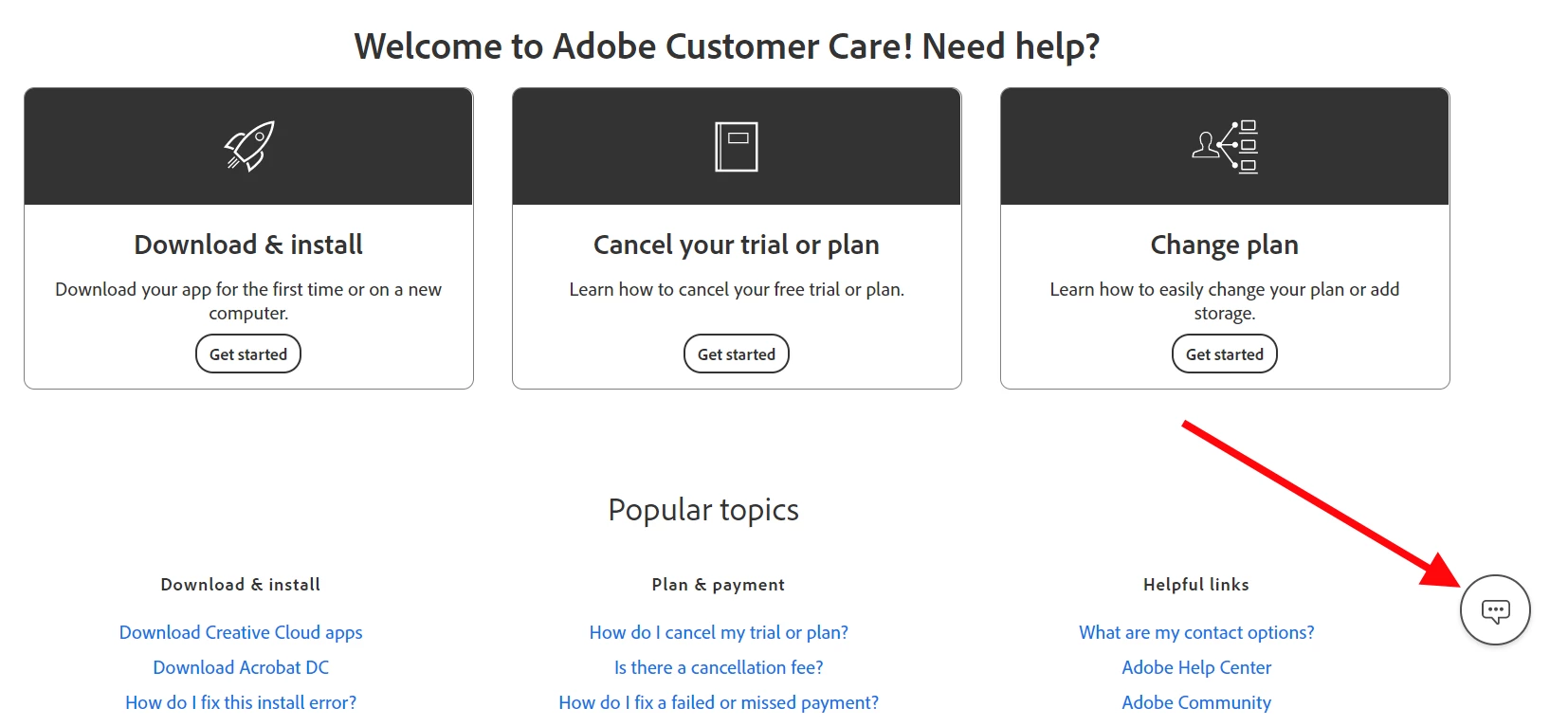 If none of the help articles given there address your issue/question, then you can contact Adobe by clicking the small callout icon at the lower right of that page... and answer the questions and/or type "agent."