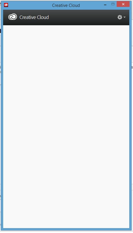 For the past few weeks, my Creative Cloud client on Windows 8.1 has displayed a blank screen when opened. There is literally nothing at all inside the window, so I can't download or update products, or access any menu. The only menu that does display is the gear icon, which lets me quit the client.