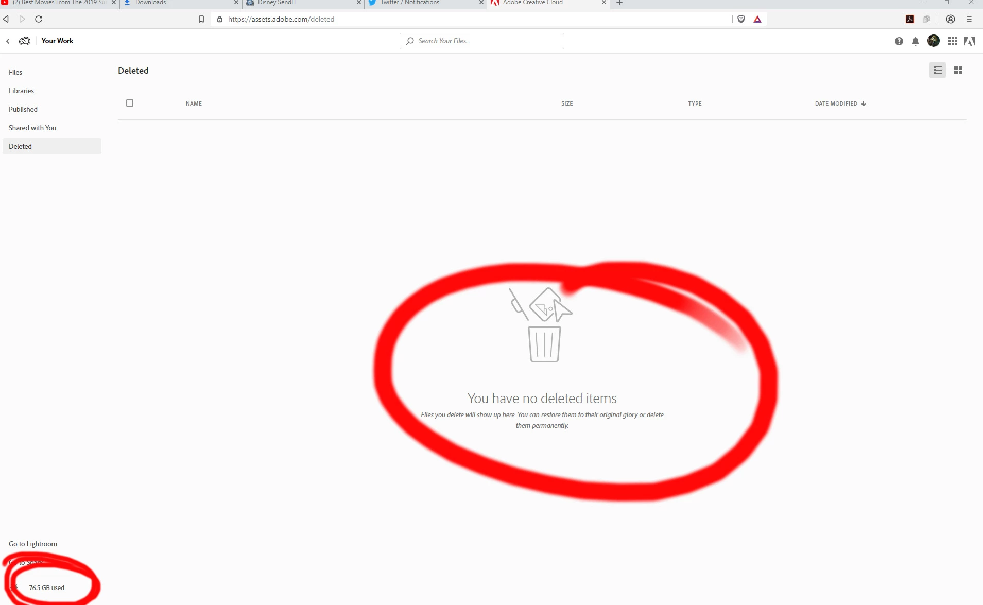 I've EMPTIED ALLLL folders. all my folders on my desktop, online on the cloud. in all the locations as empty. I've completely emptied the Deleted / Archive folders for Assets. all is empty HOWEVER It's telling me i'm still using 75% of storage. No one at adobe has been able to help me and they keep escalating the issue.