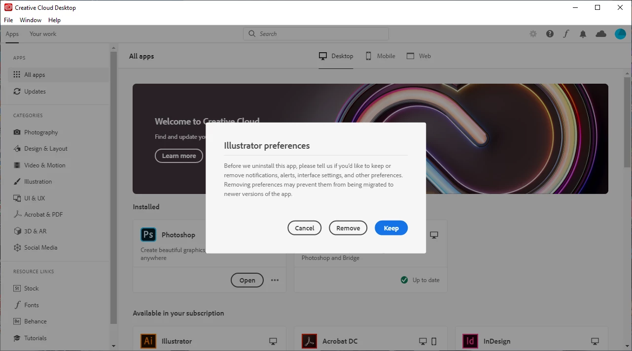 Whenever I have Creative Cloud running in the background, every 20 minutes or so it opens and prompts me about uninstalling Illustrator. In the screenshot above, you can see that I do not even have Illustrator installed on my computer, I used to have it but uninstalled it because of not needing it. I have hit "Cancel, "Remove" and "Keep", and none of them fix it. If I hit "Remove" or "Keep" it attempts to uninstall Illustrator.