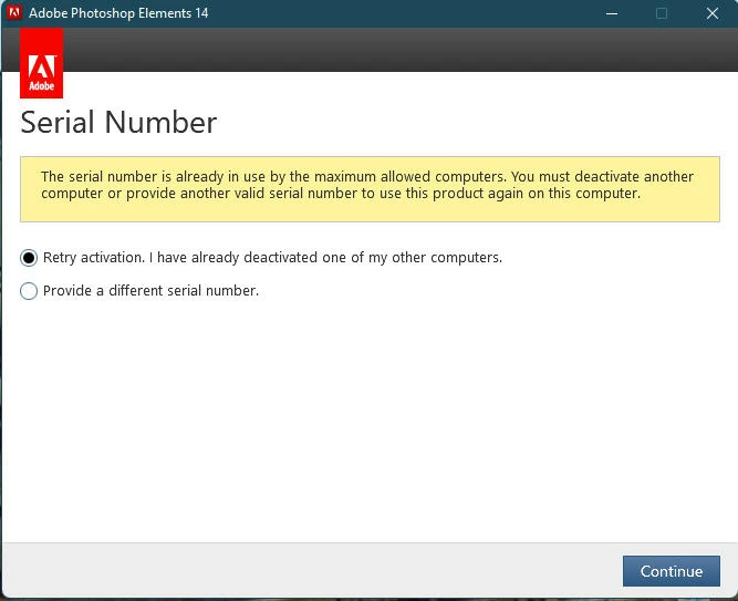 Recently reinstalled PSE 14 on new computer after fatal crash of old. Photoshop Elements runs fine, but am getting serial number error on Editor as shown: