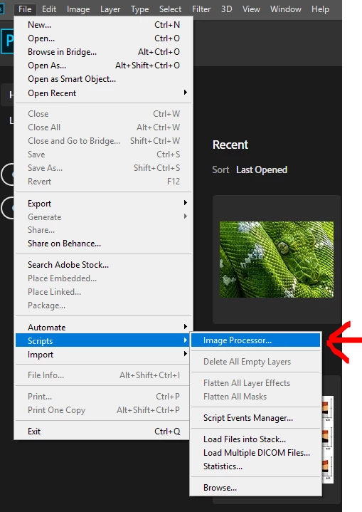 We will now use the image processor (File->Scripts->Image Processor...) to modify all the files beforehand: