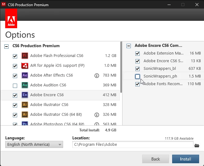 Adobe Encore CS6 no (conditional on deselecting the SonicWrappers_ph component)