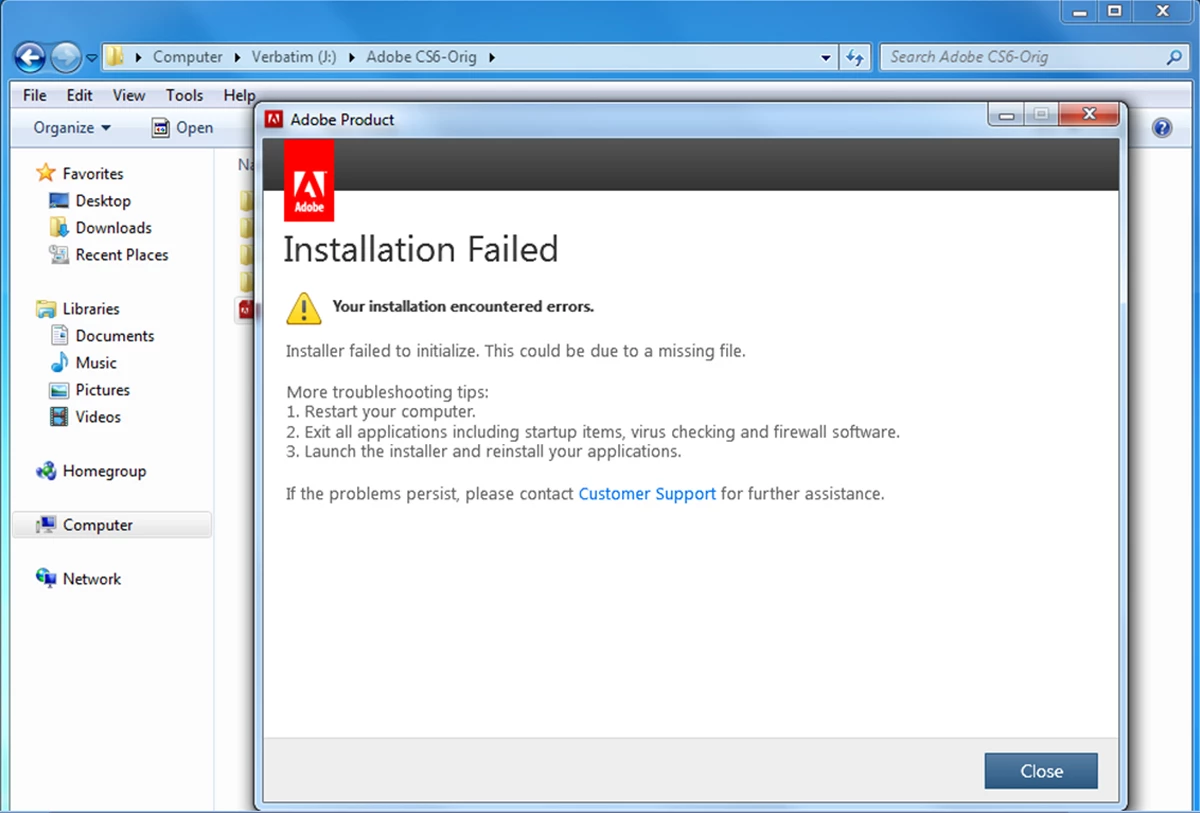 I am getting an "Installer failed to initialize" error on a clean installation of CS6 Design and Web Premium when I attempt to load it onto my PC. I am running Windows 7. I have tried several solutions to no avail. Please advise.