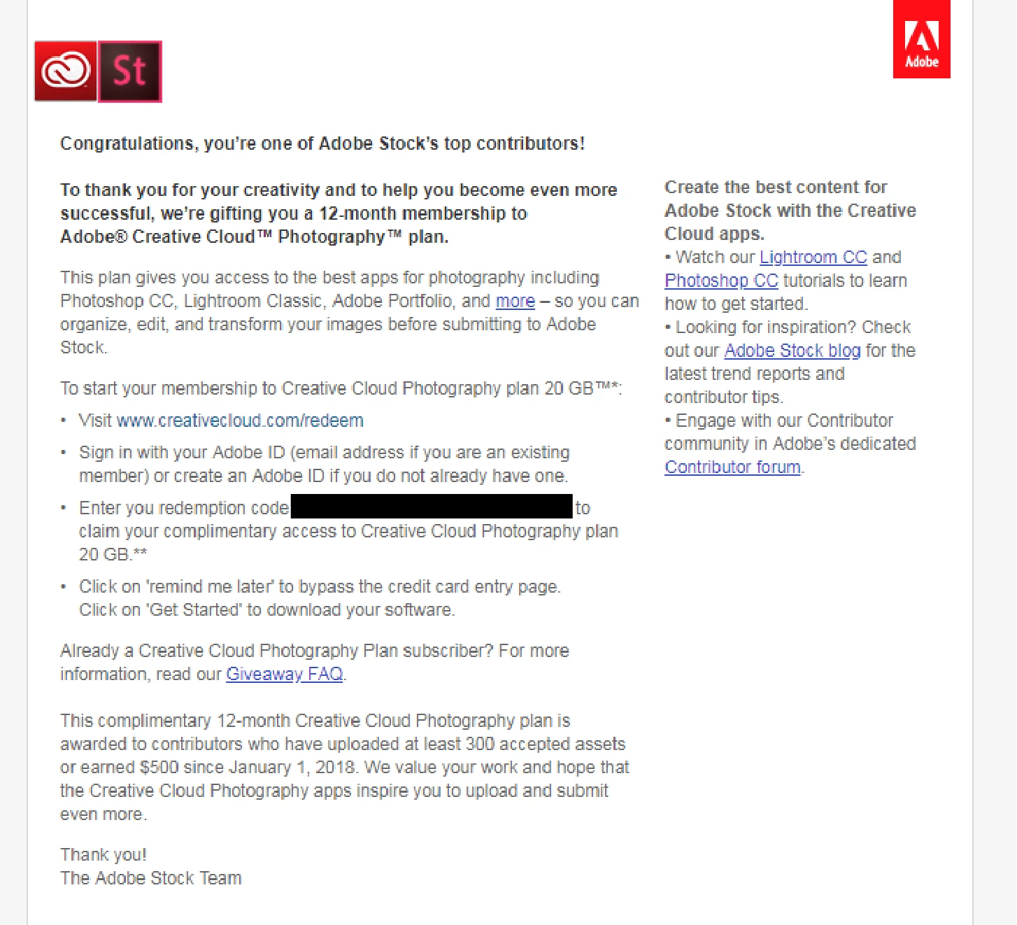 On 17 of Aug, 2018 I received a redeem code for free 12-month Adobe Vreative Cloud Photographer Plan. I received it as Adobe stock contributor within a promotional giveaway. This code is awarded to contributors who have uploaded at least 300 accepted assets or earned $500 in 2018.