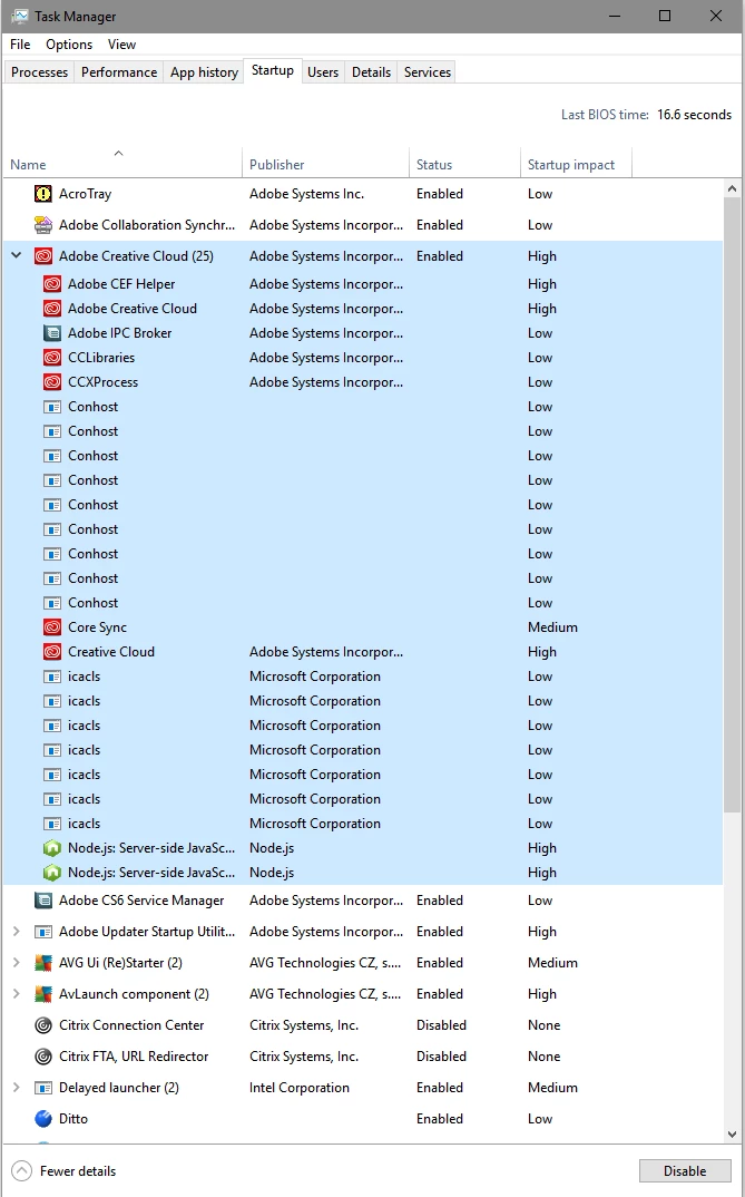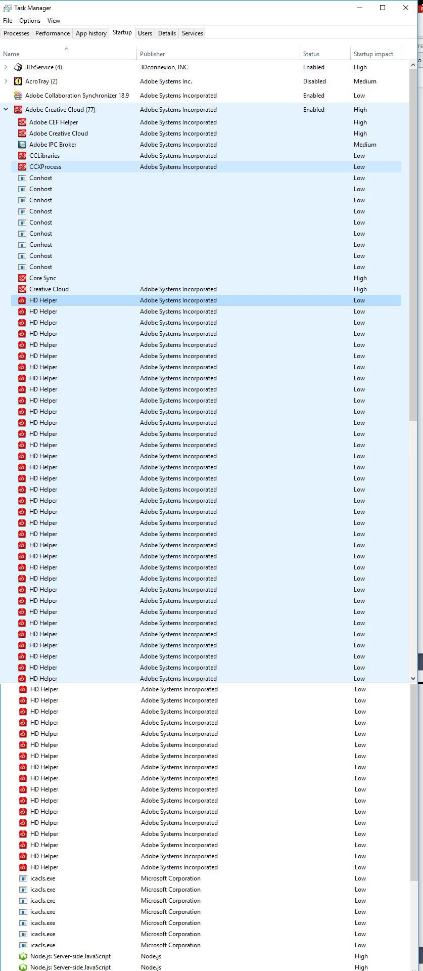 Explanation and question..., I'm going through my startup folder and disabling items not needed at startup. My Windows 10 PC is suffering from nasty freezups and wait times while doing remedial tasks and often when I have Adobe apps/photoshop open. I get to "Adobe Creative Cloud" in the list of startup items which also has "(77)" after the name. I click the drop down arrow and I see this massive list of duplicate services. (9x) conhost, (52x) HD Helper, (7x) icacls.exe, (2x) Node.JS Server-side JavaScript. Can someone tell me if this seems correct,or if this shows that something is wrong with my setup? The Adobe CC software is up to date as far as I know, just recently having another full apps update.