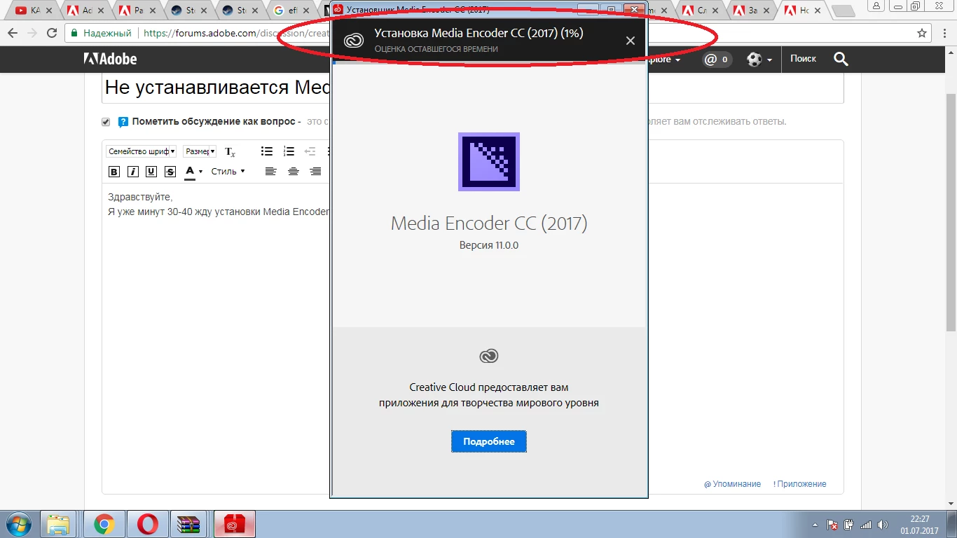 Я уже минут 30-40 жду установки Media Encoder CC, но загрузка зависла на 1 %, ни примерного времени, ничего.