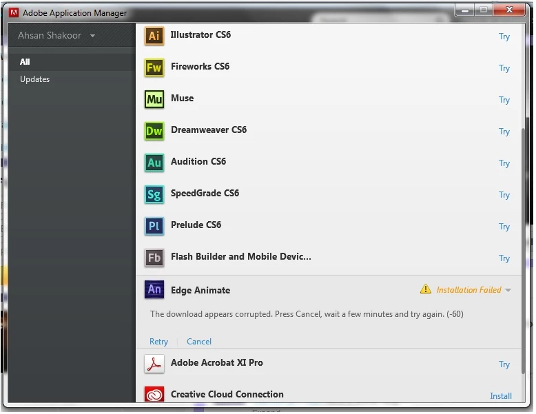I am having trouble while installing Adobe Edge Animate from Adobe Application Manager. The downloading is always stucked at 1% and after 5 minutes, I get the error "Installation Failed". The screenshot is attached.