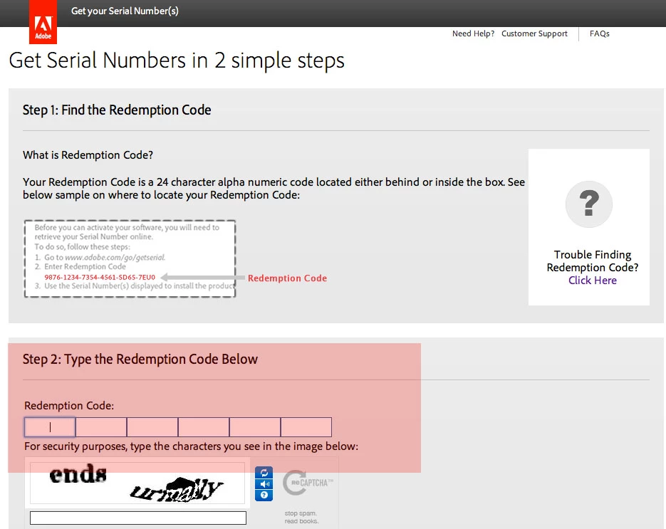 Where do I put my redemption code to retreive my serial number for Photoshop Elements 10?