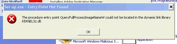 I'm trying to install Adobe Creative Cloud, but I end up getting this error message... "Set-up.exe - Entry Point Not Found: The procedure entry point QueryFullProcessImageNameW could not be located in the dynamic link library KERNEL32.dll."
