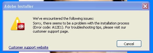 Then, when I click "OK", I get this Adobe Installer error message with the "Error code: A12E1".