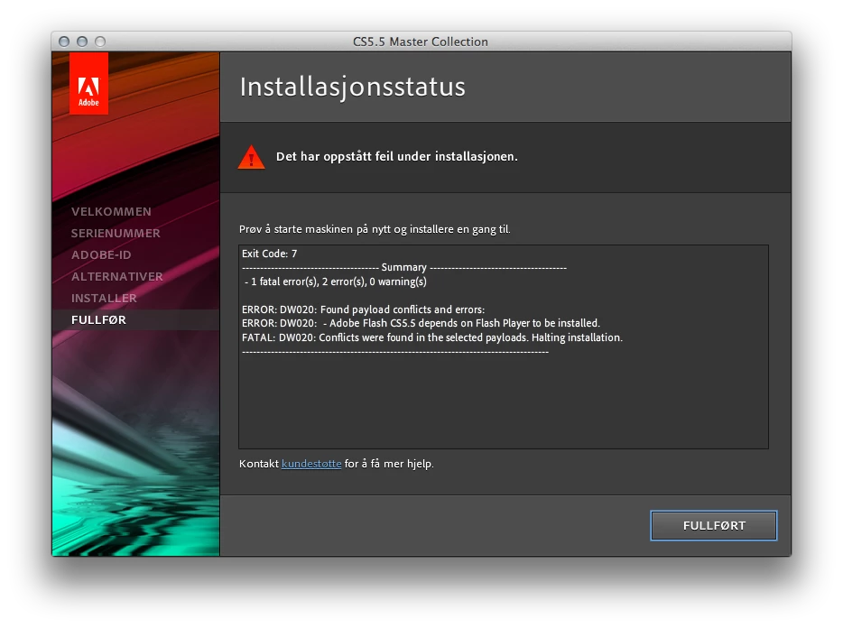 I purchased CS5.5 Master Collection from Adobe online and installed all the applications. Later, i discovered that Acrobat X Pro was NOT in my application folder on my Mac. I then started the installer (for the Master Collection) and chose only Acrobat X to install. The first strange thing is that the installer says (below the Acrobat X Pro line in the list of applications to install) that "Acrobat X Pro is allready installed!". - But it isn't, and when searching for it in Spotlight, the result is 0 found. - So, I started to install it again, but then I get these error messages: