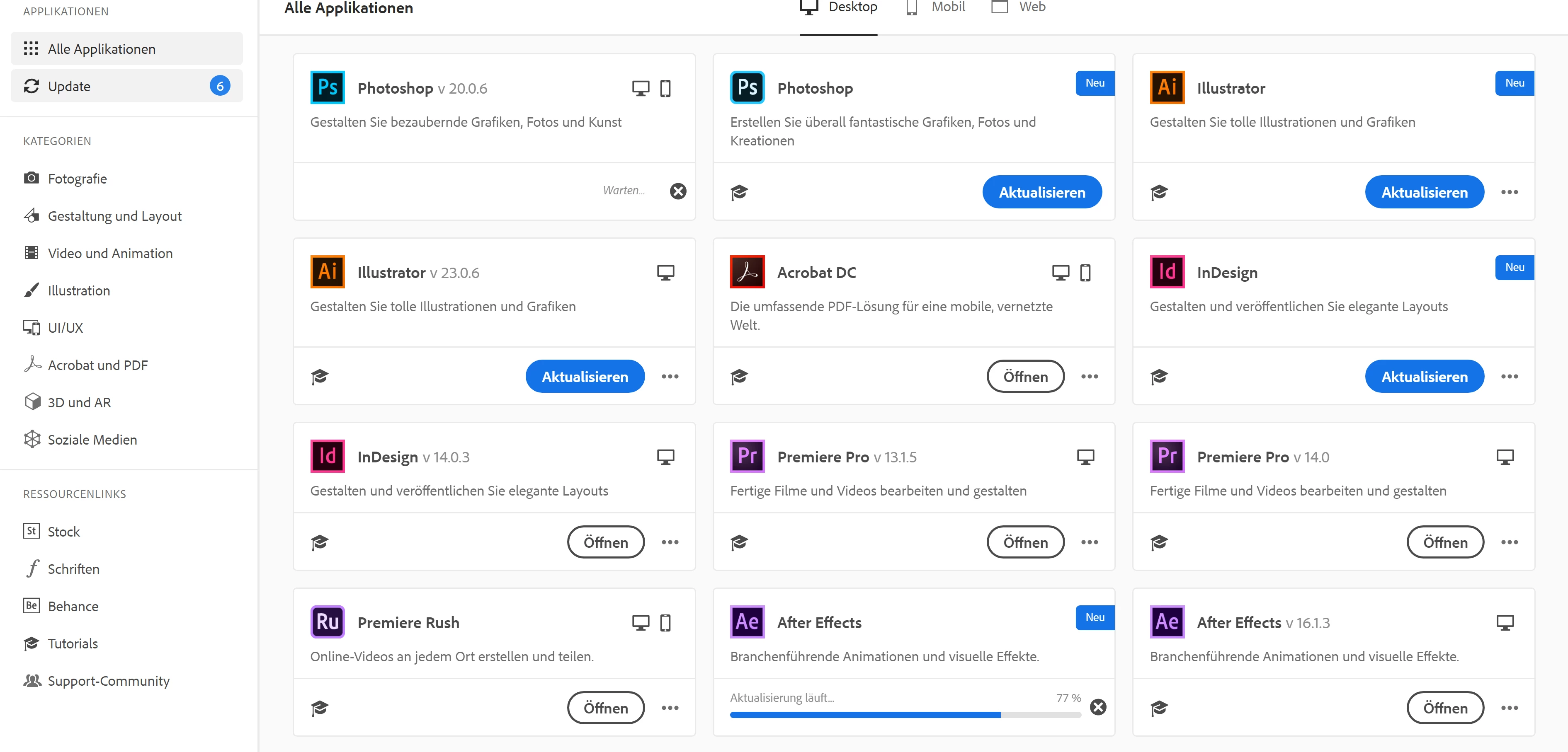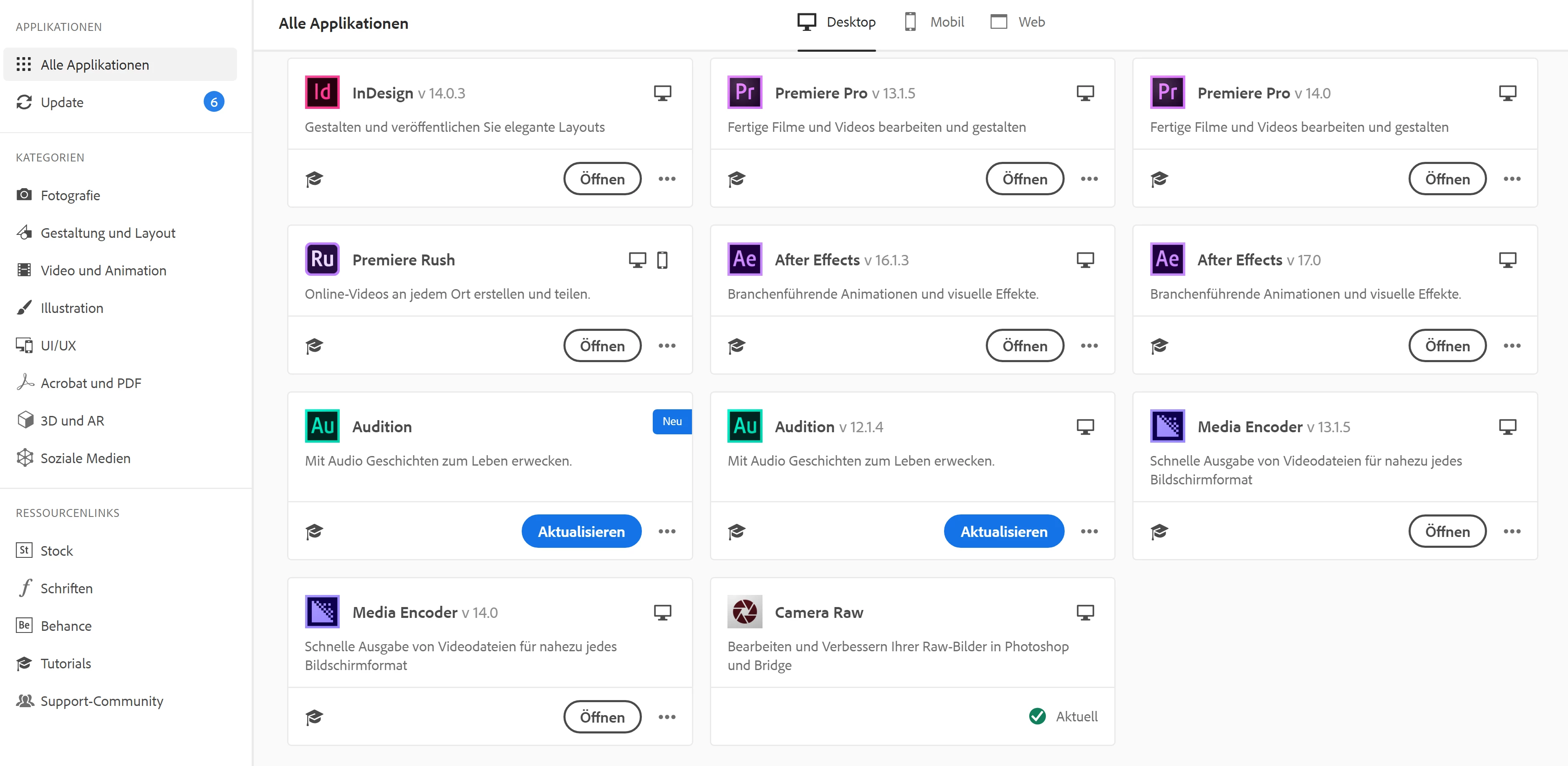 The CC Desktop App shows me two apps that are ready for an update. So, in the screenshots, you can see that I have the versions 13.1.5 and 14.0 of Premiere Pro. So far so good, but you can also see two versions of Photoshop ready for an Update- one showing the version 20.0.6 and the other showing nothing. Exact thing with After Effects, Illustrator, InDesign and Audition. I even have installed the newest version of InDesign and it still shows me a second InDesign to update. So, why are there two versions each and which one is the newer one? The one with "v...." or the one without showing the version? Should I update both of the same app like both Audition apps?