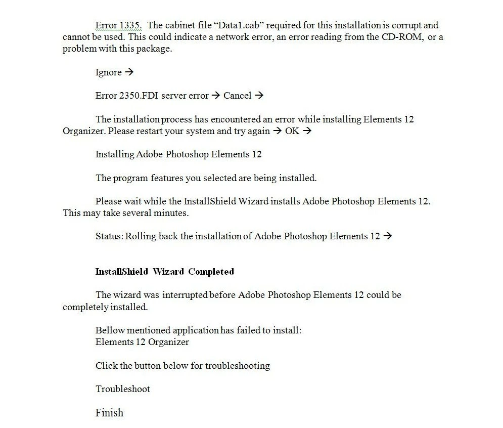 Hallo, I have problem to install photoshop elements 12. When I click on the setup icon, the installation progresses normally after inserting my region and the serial number of the program but then I have this sequence of messages: