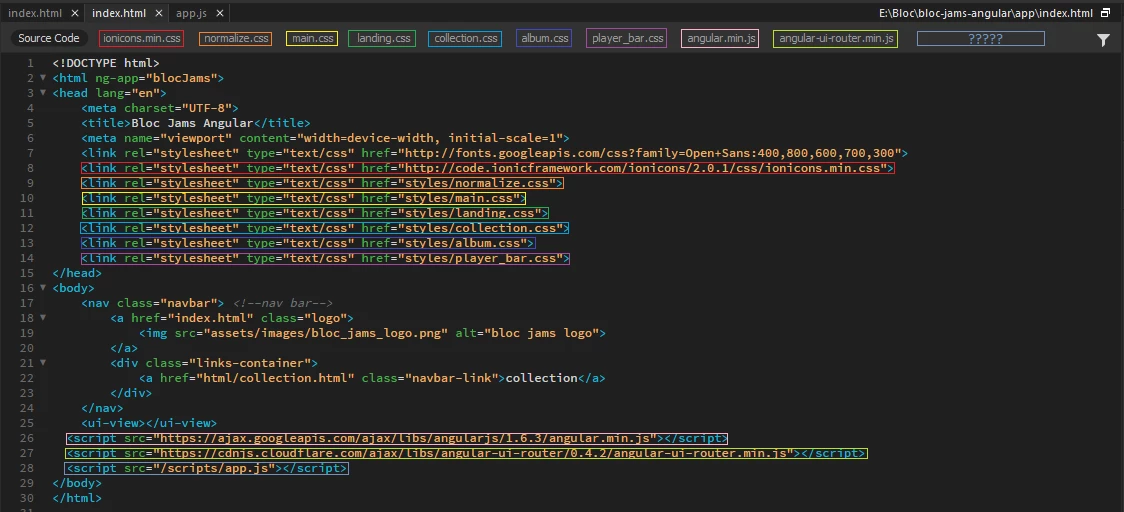 This image pretty much sums it up. I've got 10 (now 11) source links in this HTML source code. First one is for a google font. Next is for web icons. Next 6 are for CSS styles sheets. At the bottom I have three AngularJS files linked to. The first is the minifed version of Angular then a link to the Angular UI Router. Last one shown here is to my app.js file but it doesn't show up in the Related Files at the top. I've since added another AngularJS file which deals with some elements of a specific view.