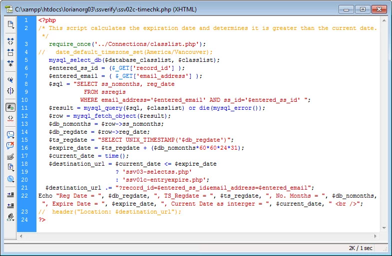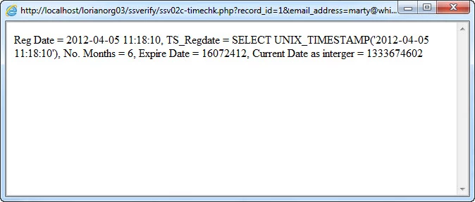 I have a process where I want to compare the current date with an expiration date that is so many months after a registration date. The registration date is stored in a MySQL timestamp format. I want to convert this to a Unix timestame so I can do the comparison with Time(). I have tried both the MySQL UNIX_TIMESTAMP and the PHP getTimestamp() functions and cannot get them to work. I have tried UNIX_TIMESTAMP both in the original SELECT statement and as a stand alone one. I also get a divide-by-zero error with the date_default_timezone_set function. I have enclosed screenshots of the code and the result of the echo at the bottom. THANKS!