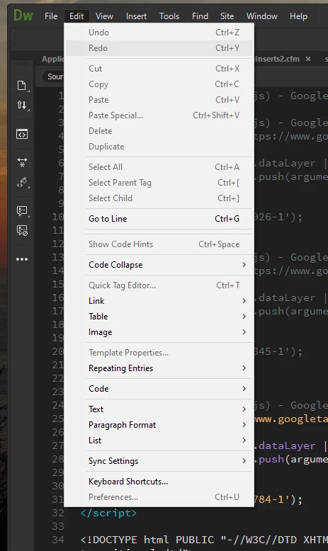 Using DW v 20.1 under Windows 10 64-bit, many menu functions are grayed out/nonfunctional. Includes copy, cut, paste, about Dreamweaver, open, close, close all, etc.