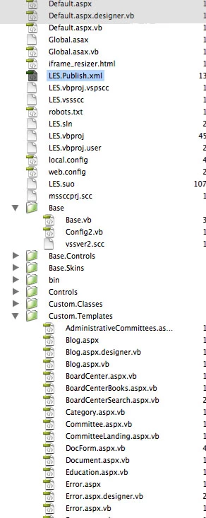 I am working with a content management system. Since I am pretty proficient with HTML and style sheets I asked the developer if I could have access to the orginal templates and files so I could modify it for specific purposes. He sent me all the files and I opened them in Dreamweaver hoping I could edit them there. I open the .aspx and .vb files but don't see anything there that looks remotely like I could work with. I am attaching a screenshot of a partial menu of files. Is it possible to work with these files and if so where do I start?