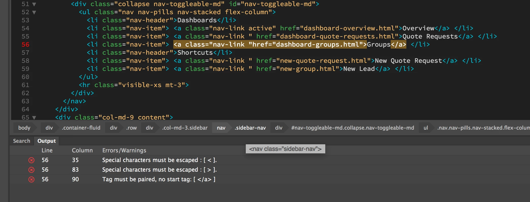 It's because you are missing a closing double quote at the end of all of your nav-link classes.