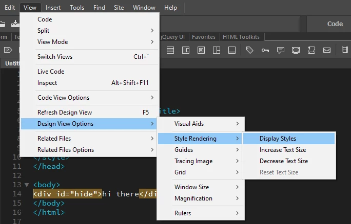 This will likely make your page appear to blow apart, don't worry, nothing has changed in your actual code, just how DW's design View handles it. You should now be able to see and interact with any object hidden with "display:none"
