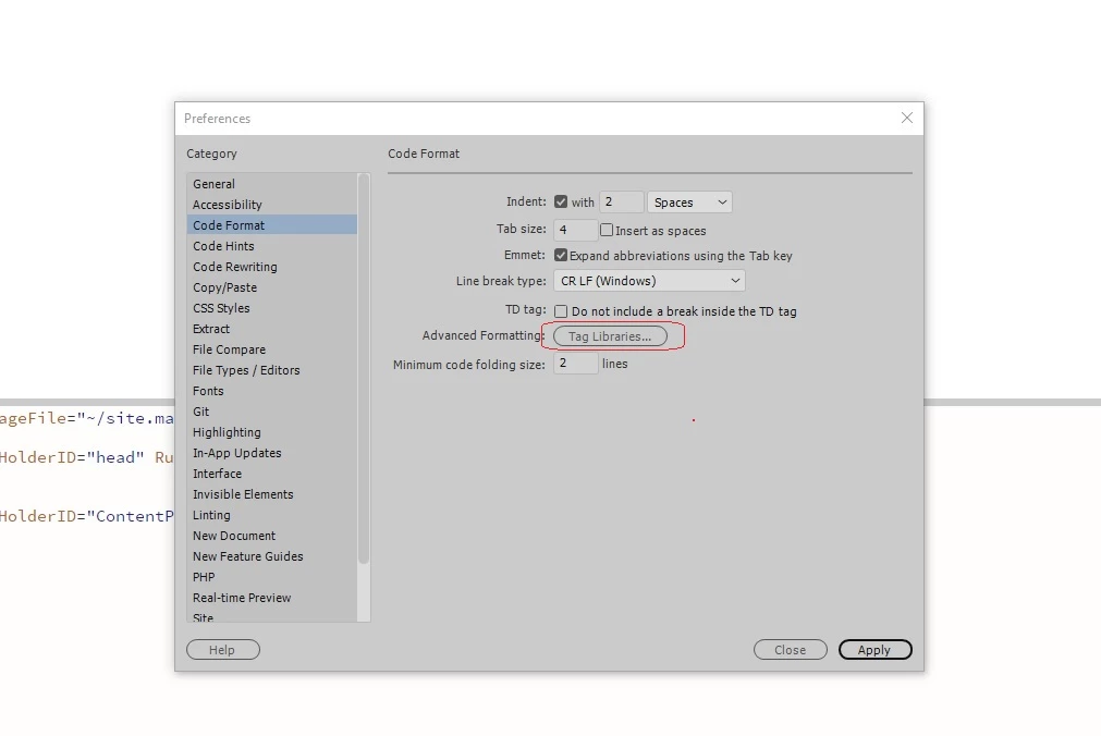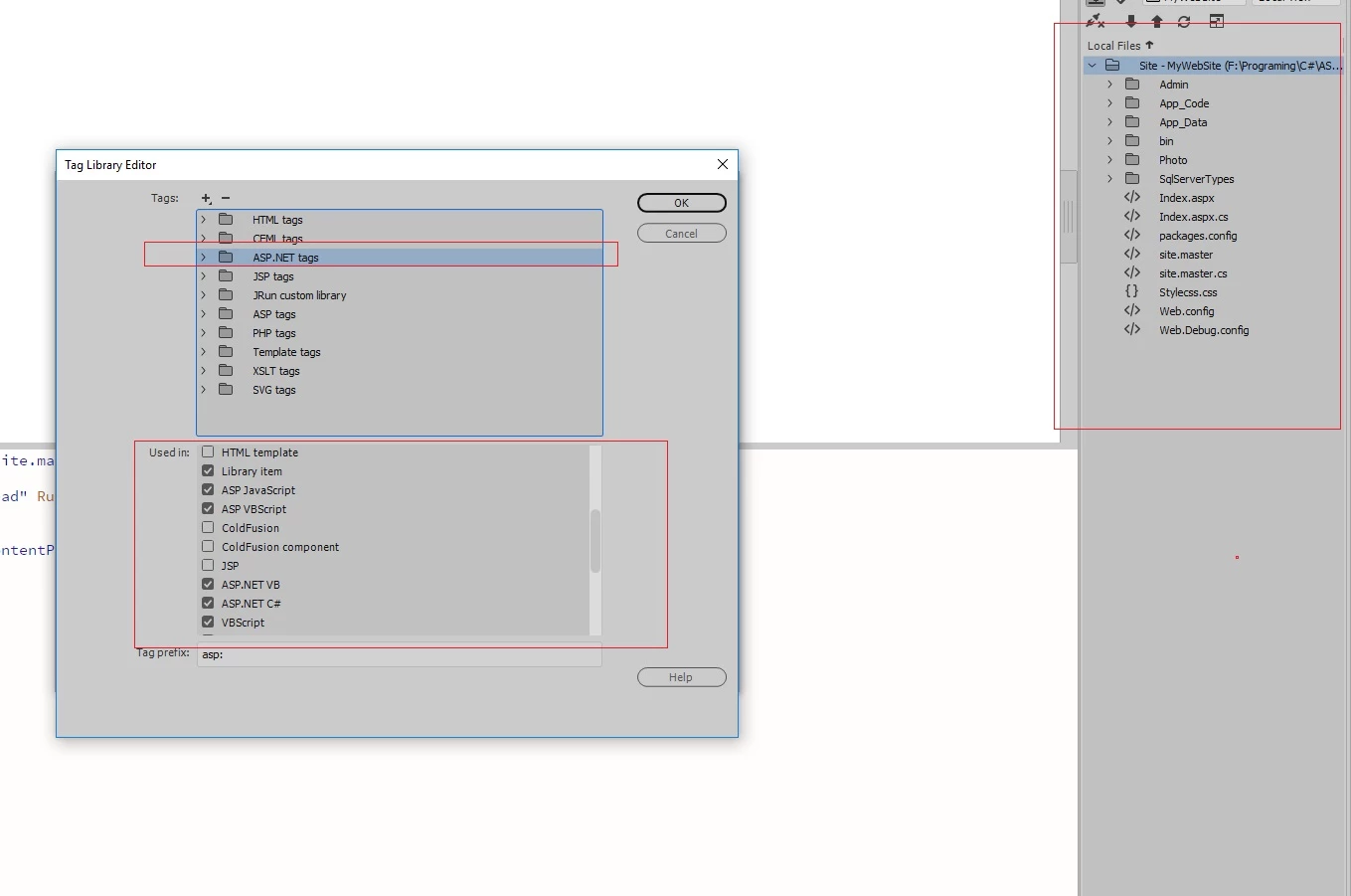 I installed Dreamweaver cc 2018 recently & find out that in address -> Preferences/Code-format there is an option called "Tag Library", & in this library There is collection of ASP.net controls. so logically it must be able to have full intellisense(the word mwe use in visual stuido & I dont know what is equal in adoe products) asp.net controls(with their property) in dream weaver. but When i try to add for example `<asp:Button ID="btn1" runat="server" />` I must write it all by my hand and there is no intellisensce that help me by guessing or auto completing my control declaring.