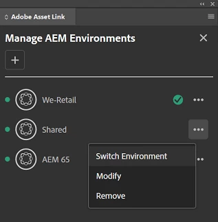 With this new release, you can now access multiple AEM environments from the Adobe Asset Link panel in your Creative Cloud app. You can add multiple environments or modify the properties of your active AEM environment. You can switch between environments and remove environments from within the panel.