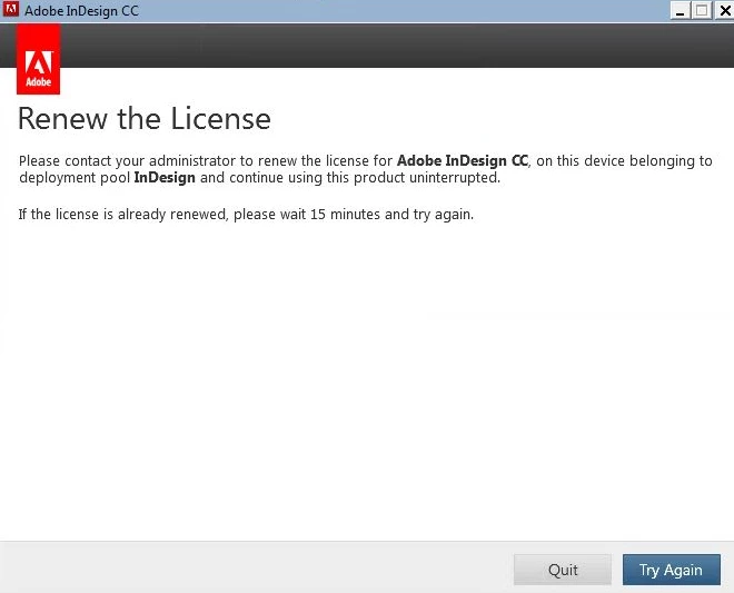 I work for a school district where we have some 14 licenses purchased for our users. The executable was created using the current active license in Adobe Indesign to deploy. The install completes but when opening up indesign, I get the below message. Checking the Adobe Adminconsole, it shows the license was given to the user but the program doesn't open at all. Please help